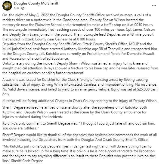 Deputies say Anthony Kutchko, 38, rode his motorcycle from Goodhope to Gainesville at speeds over 100 miles an hour.